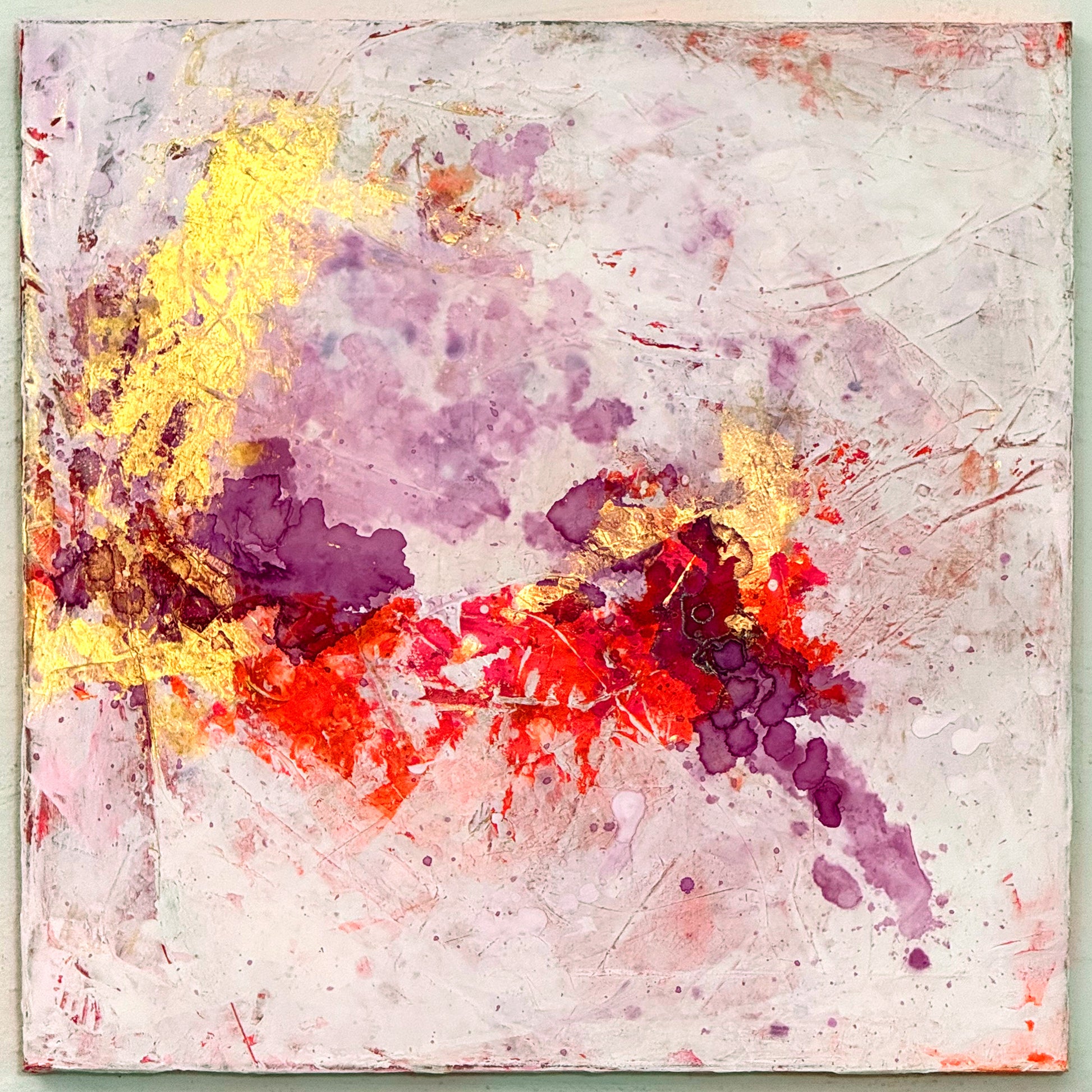 Ein Spiel aus Licht und Schichtung: Dieses abstrakte Unikat vereint auf Weise Ruhe und Spannung. Vorherrschend ist ein sanftes, fast schwebendes Weiß, das immer wieder durchbrochen wird von darunterliegenden Farbschichten – ein leuchtendes Orange, geschichtete rote Tinte und eher flächig verwendetes Gold treten subtil hervor und verleihen dem Werk eine geheimnisvolle Tiefe.