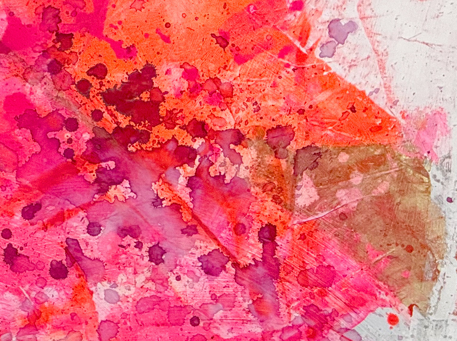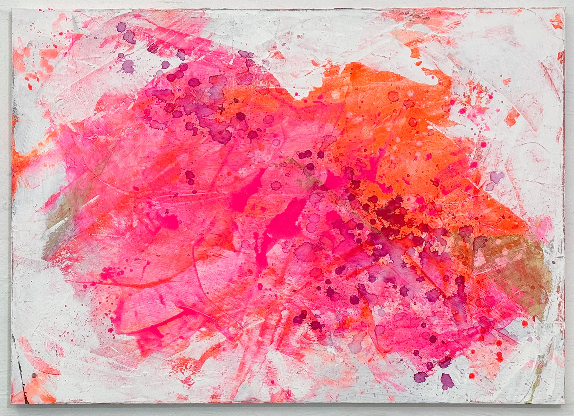 Dieses abstrakte Unikat zieht mit seiner intensiven Farbwirkung sofort in den Bann. Neon-Magenta und leuchtendes Orange dominieren die Komposition und entfalten, eingebettet in sanftes Weiß, eine vibrierende, energetische Präsenz.